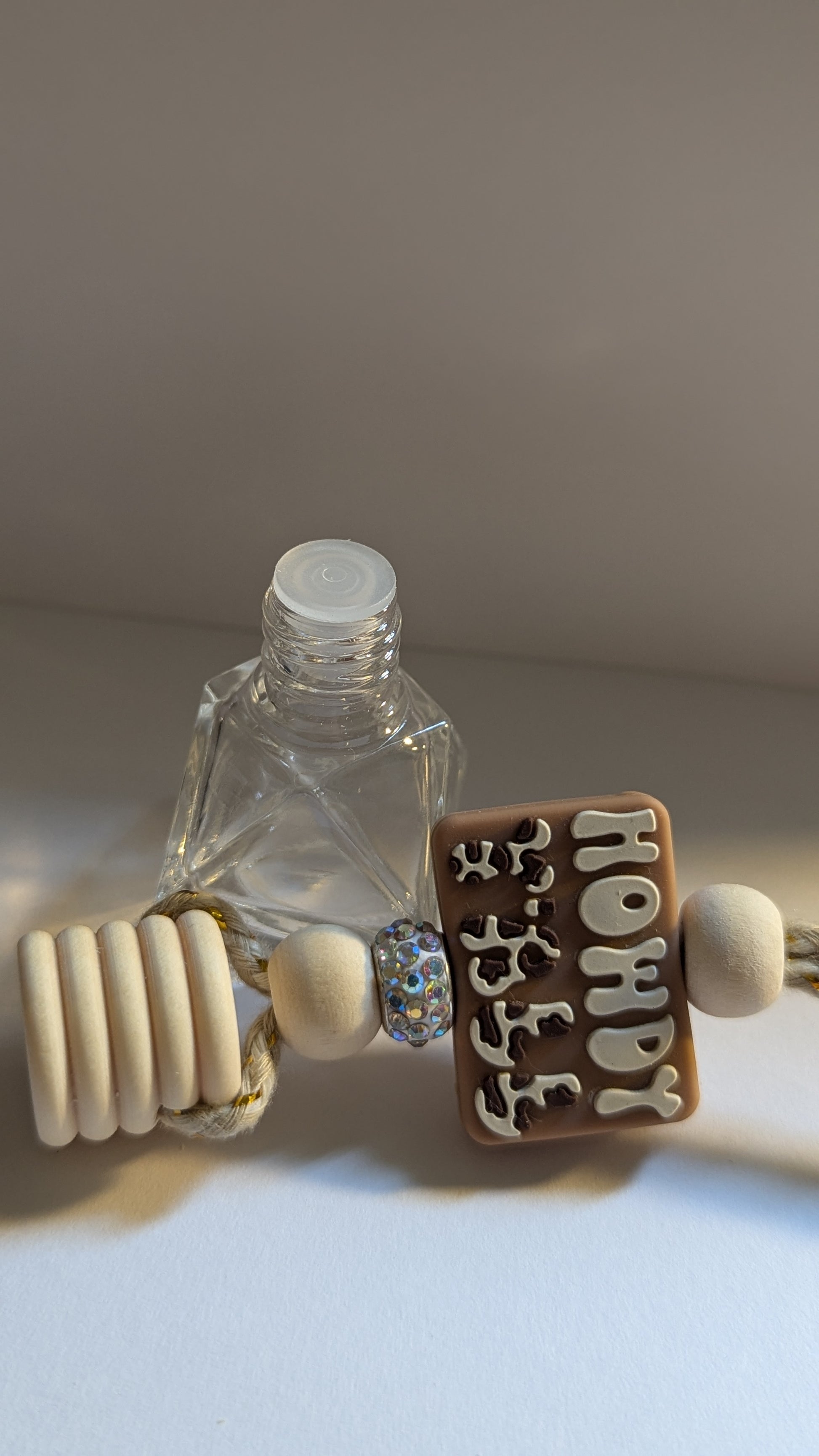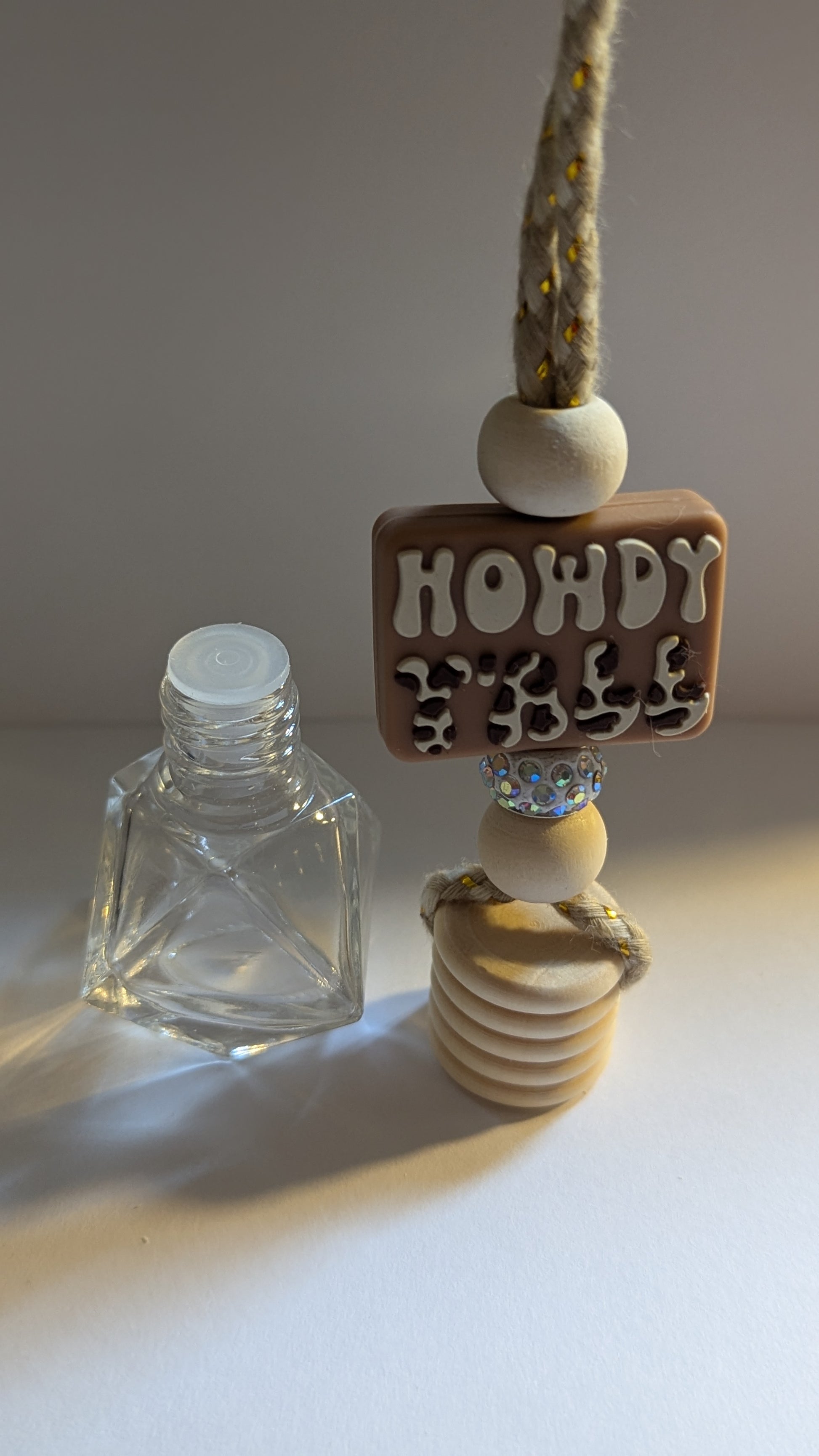 Howdy Y'all hanging Car Diffuser is a great way to bring a new style into your vehicle. Light brown silicone beads that is highlight with a beautiful multi color rhinestones. Pick what fragrance you like, order does come with an instruction card. Last over 60 days.